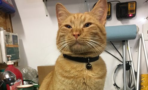 In 2011, a feral litter was found under Allen's shop at SCREAMS Halloween Park where he was director at the time. All kittens were homed except a small Tuxedo two days before opening. Who has time to find a home for a kitten when the show is about to open? So it was decided the Tux would live at the home studio as a foster until we found a a home for him. Years later, Tuxedo is still here and we are Foster Fails. Tux is a champion hunter and keeps the shop clear of mice. Most of the time....