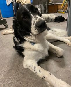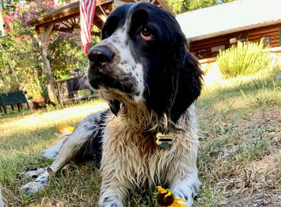 Named after the great Lon Chaney, this handsome boy is also called "The Professor" as he is always thinking something out. He is part of our Great Pyrenees/Springer Spaniel adopted trio.